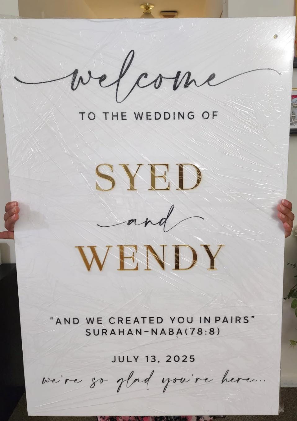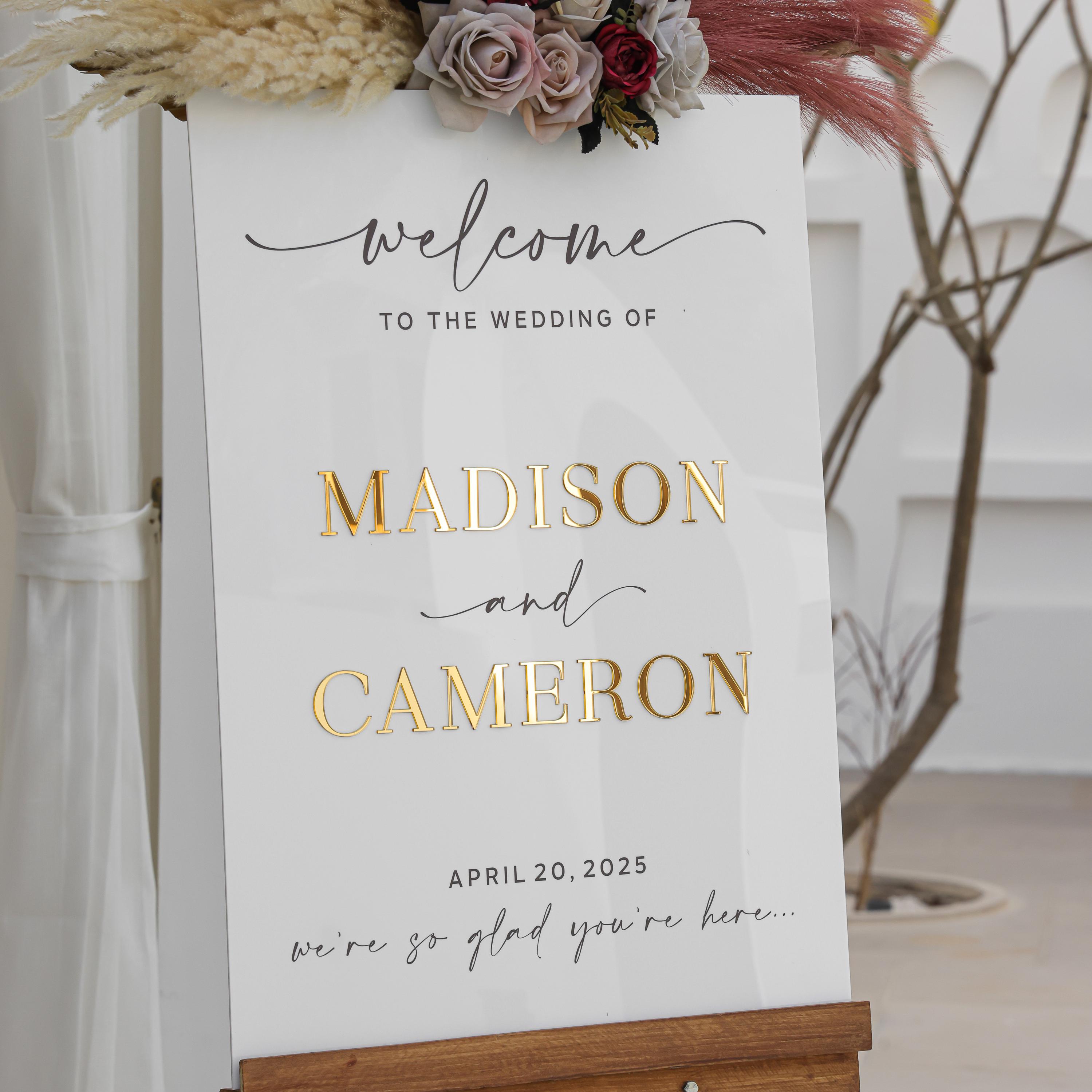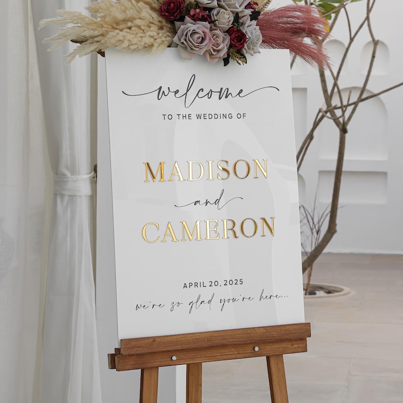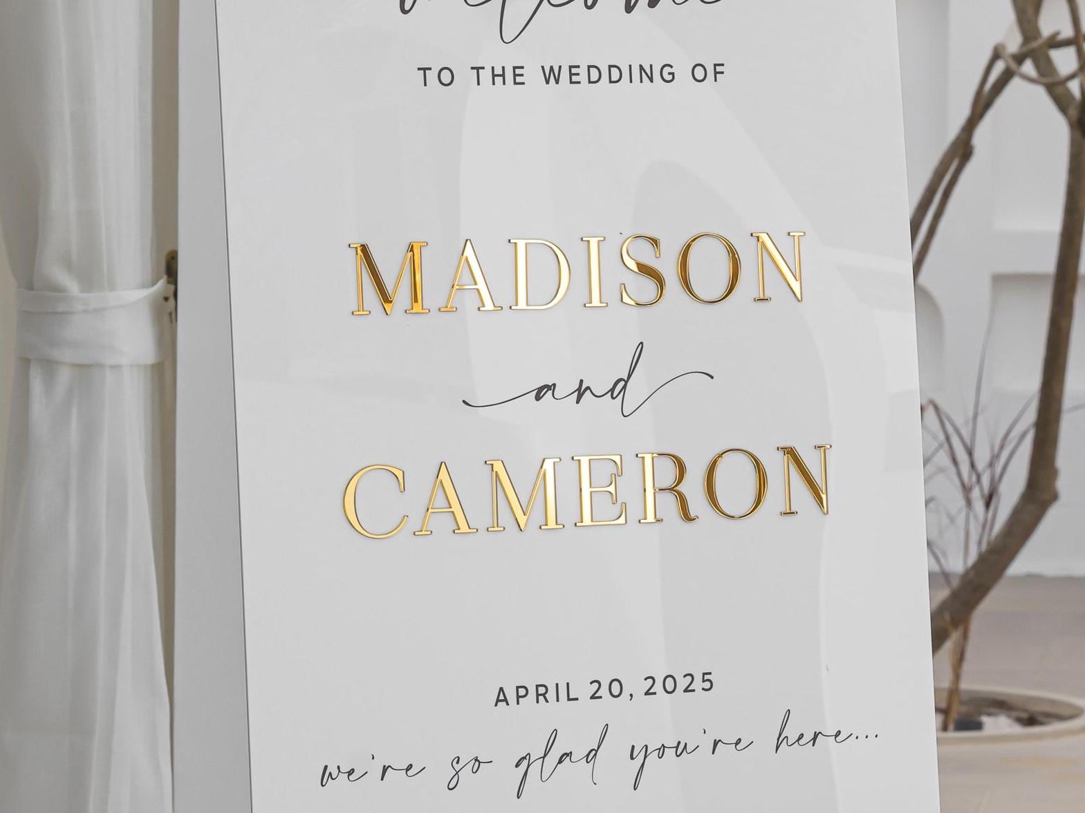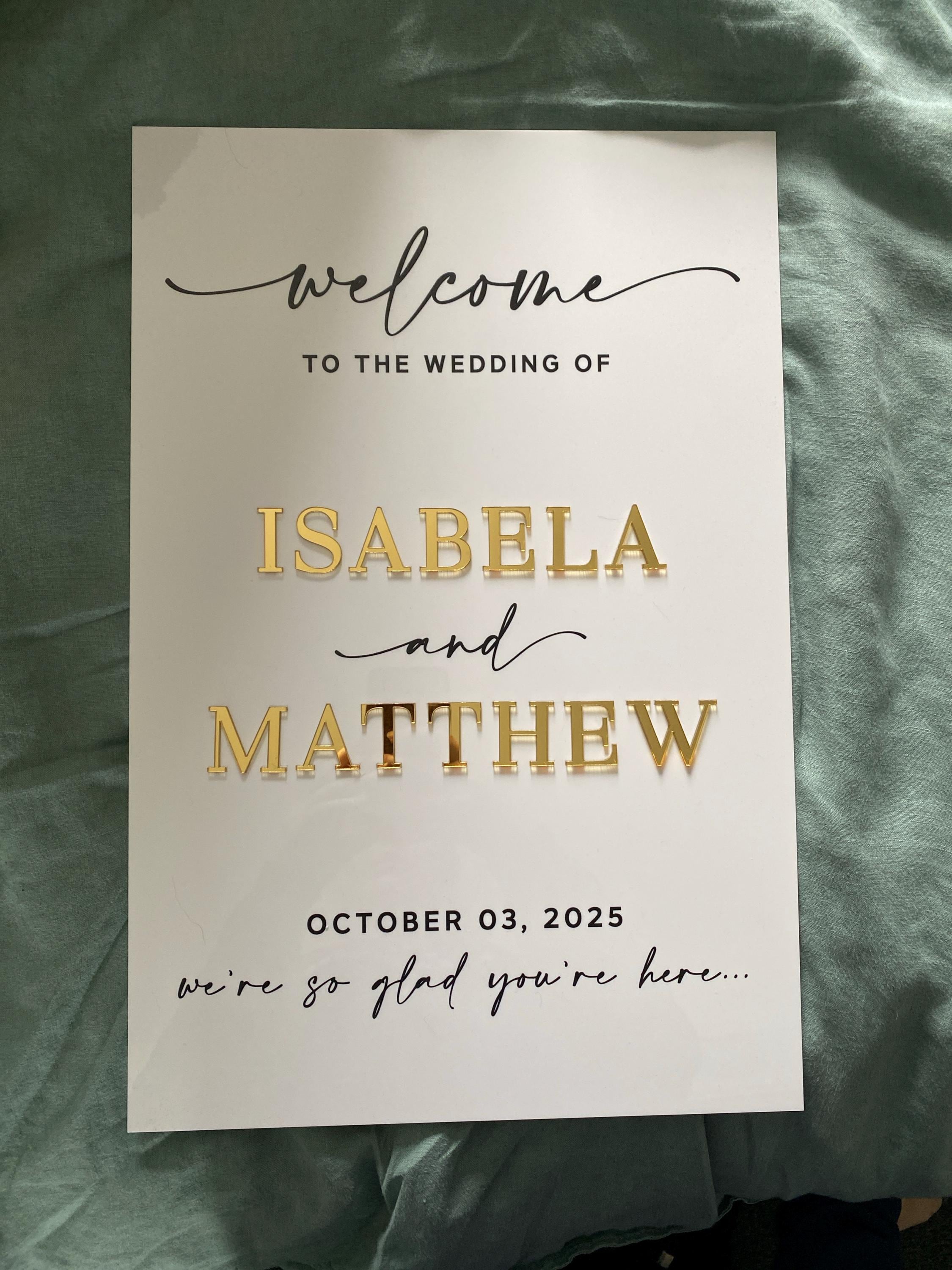 Our modern wedding welcome signs are crafted from high-quality white acrylic. The lettering is made from premium mirror gold acrylic, ensuring a long-lasting, luxurious finish. Unlike other signs that use vinyl or stickers, all of our letters are carefully raised using laser-cut acrylic to ensure precision and elegance.