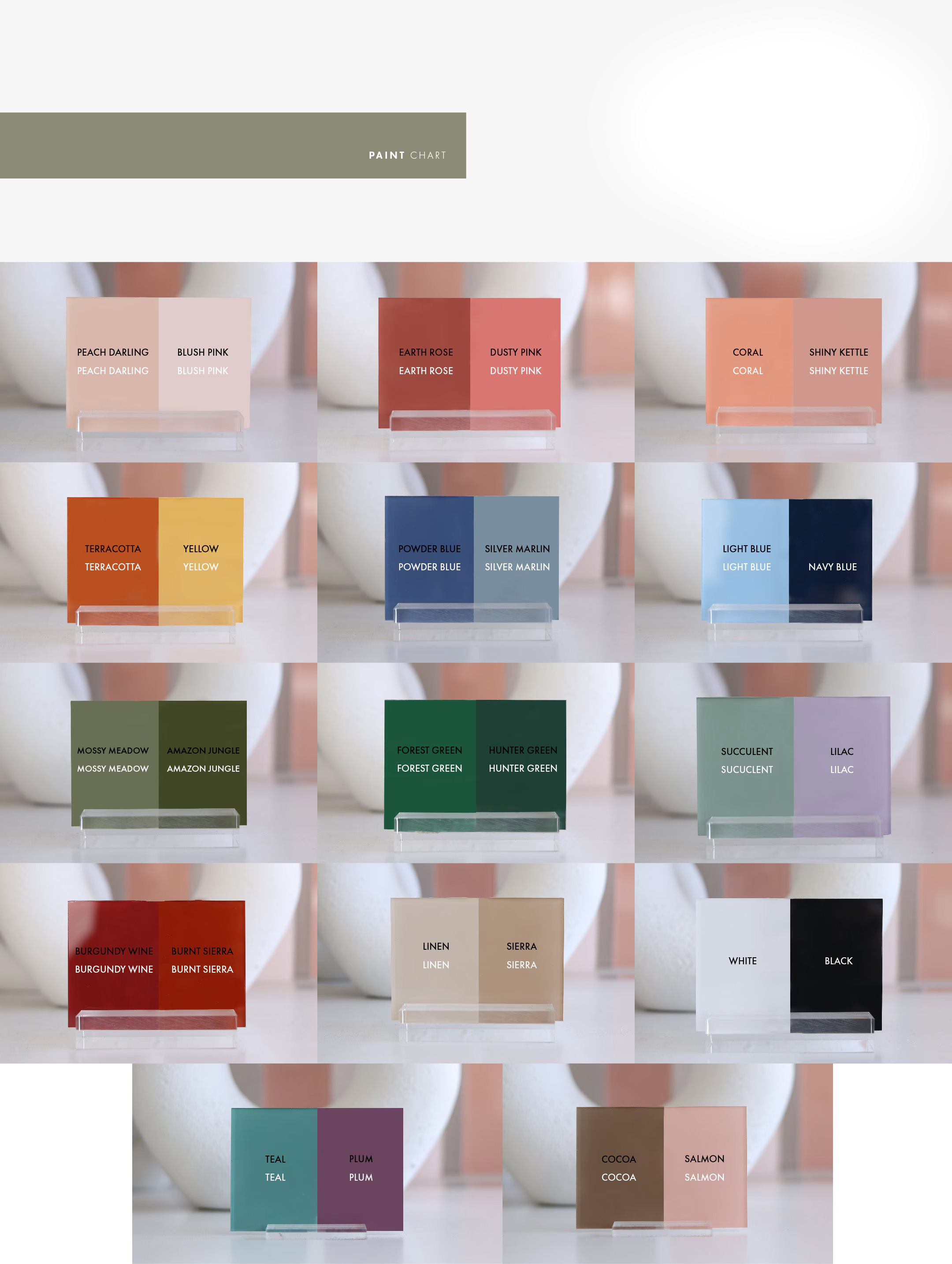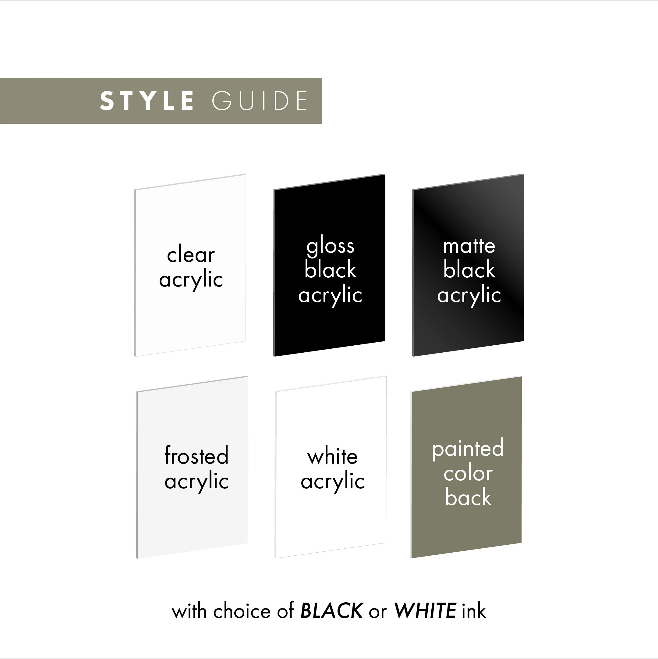 • Colors: Frosted Acrylic, Black Acrylic, Clear Acrylic, White Acrylic, Matte Black, Painted