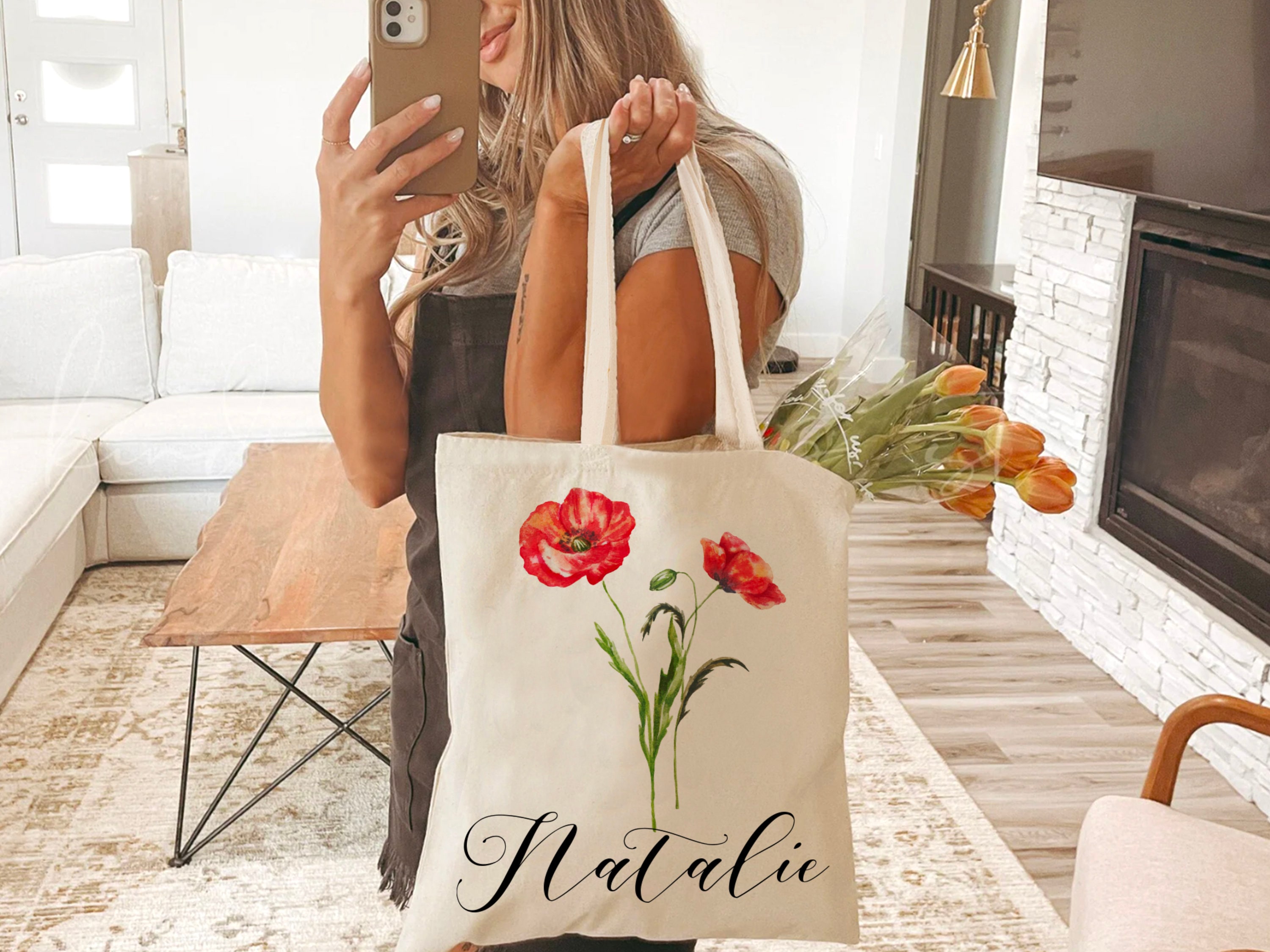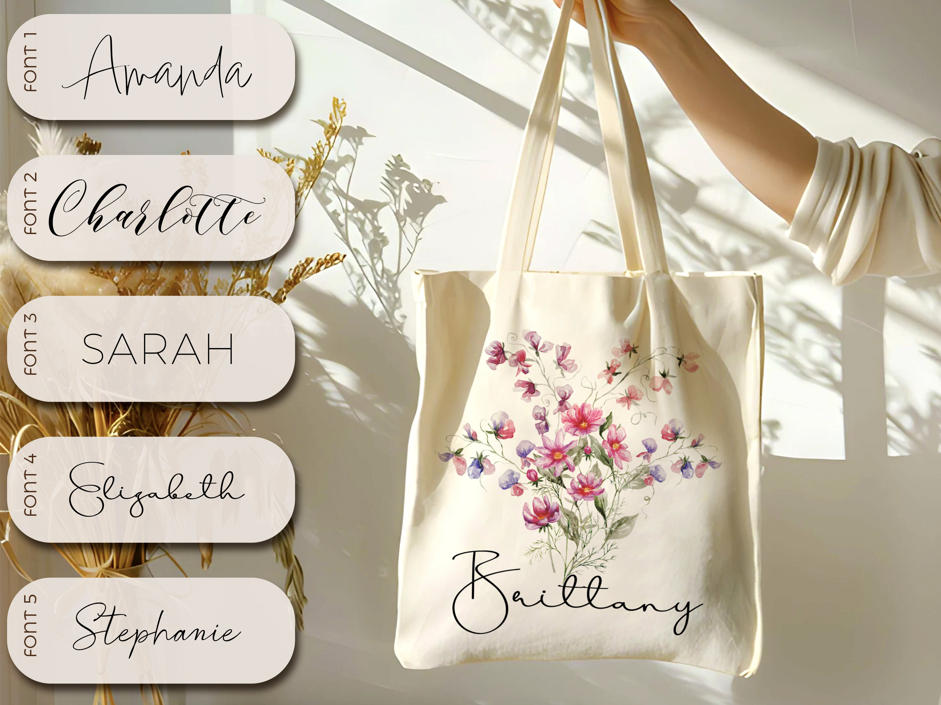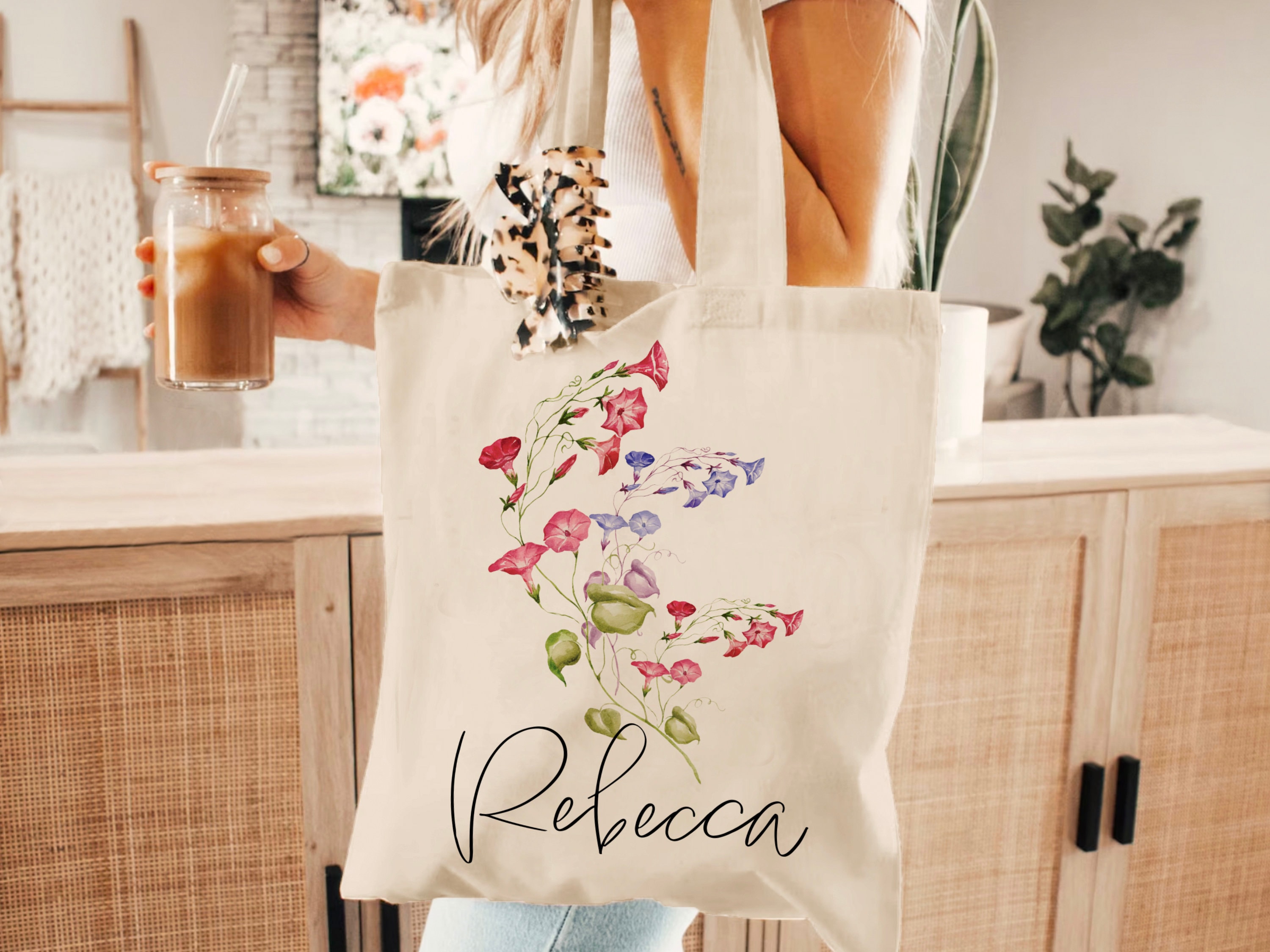 Birth Flower Tote Bag for Woman, Personalized Canvas Tote Bag for Her, Bachelorette Bridesmaid Gifts, Custom Birth Month Flower Gift for Her