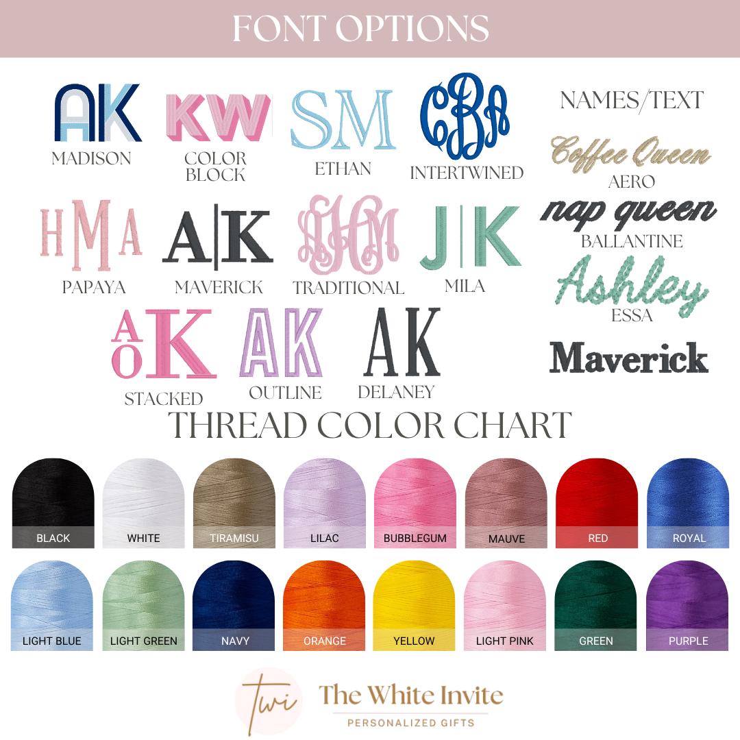 - Font color in thread of your choice (Please note if thread color is not chosen we will do black)