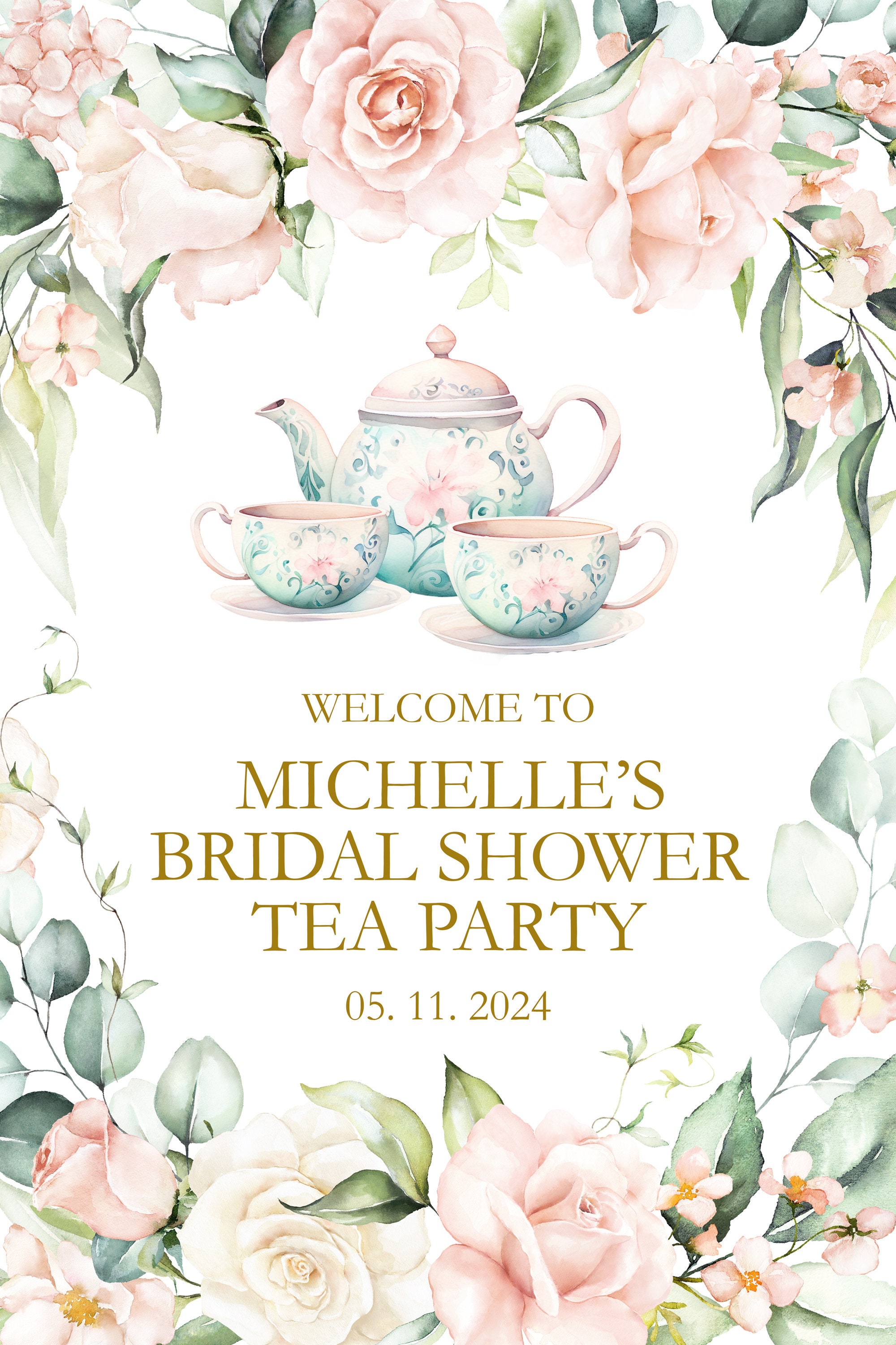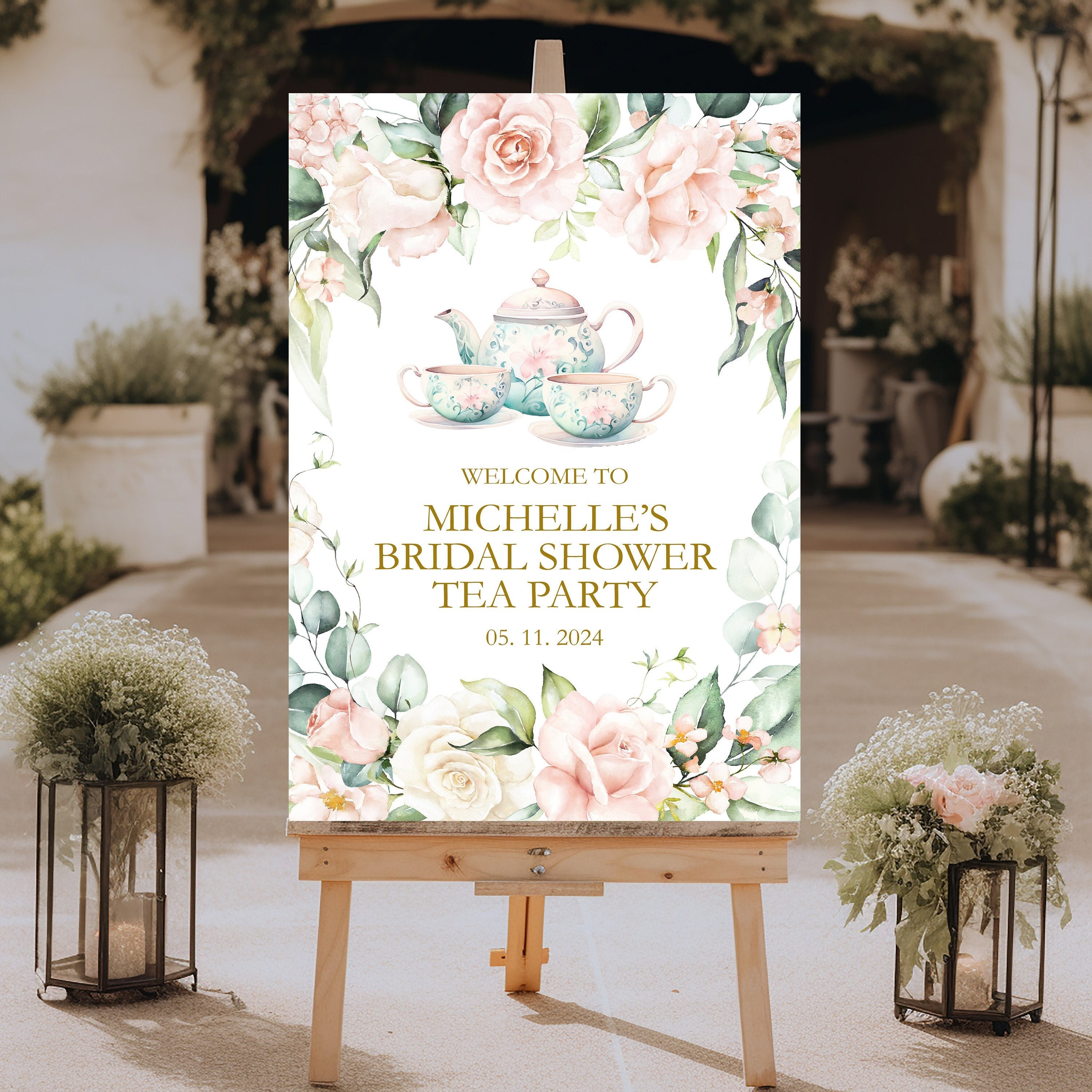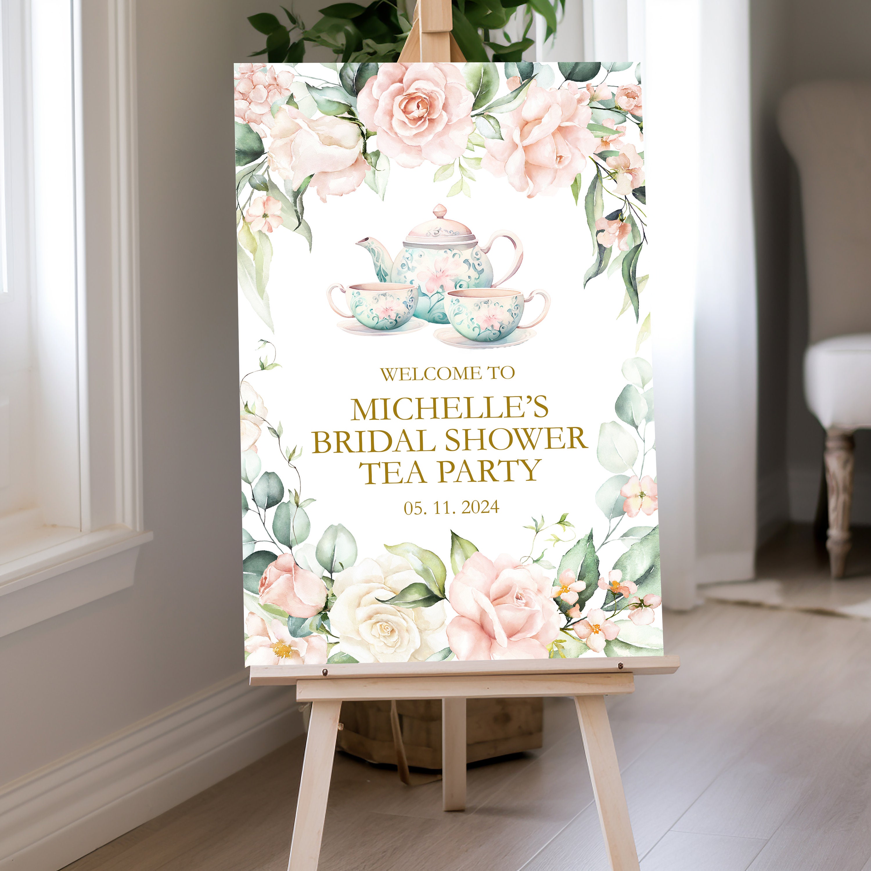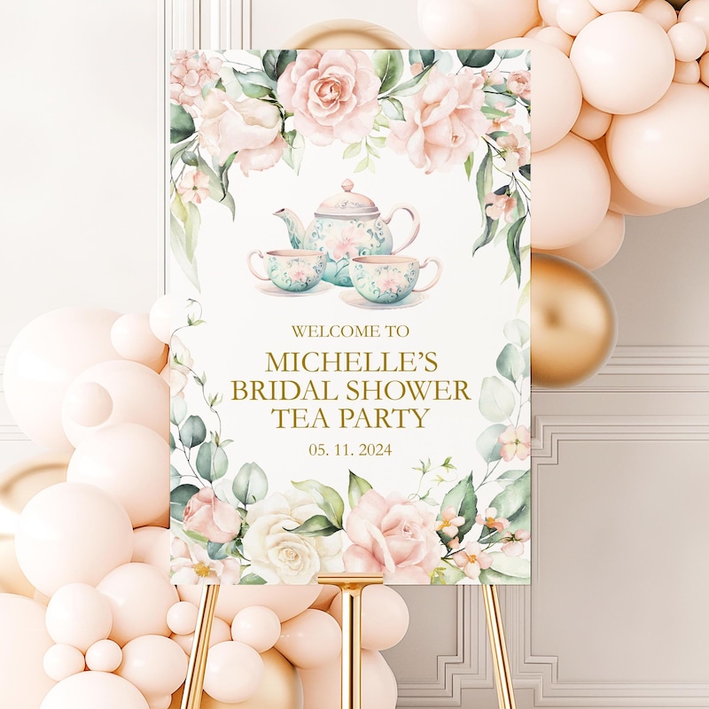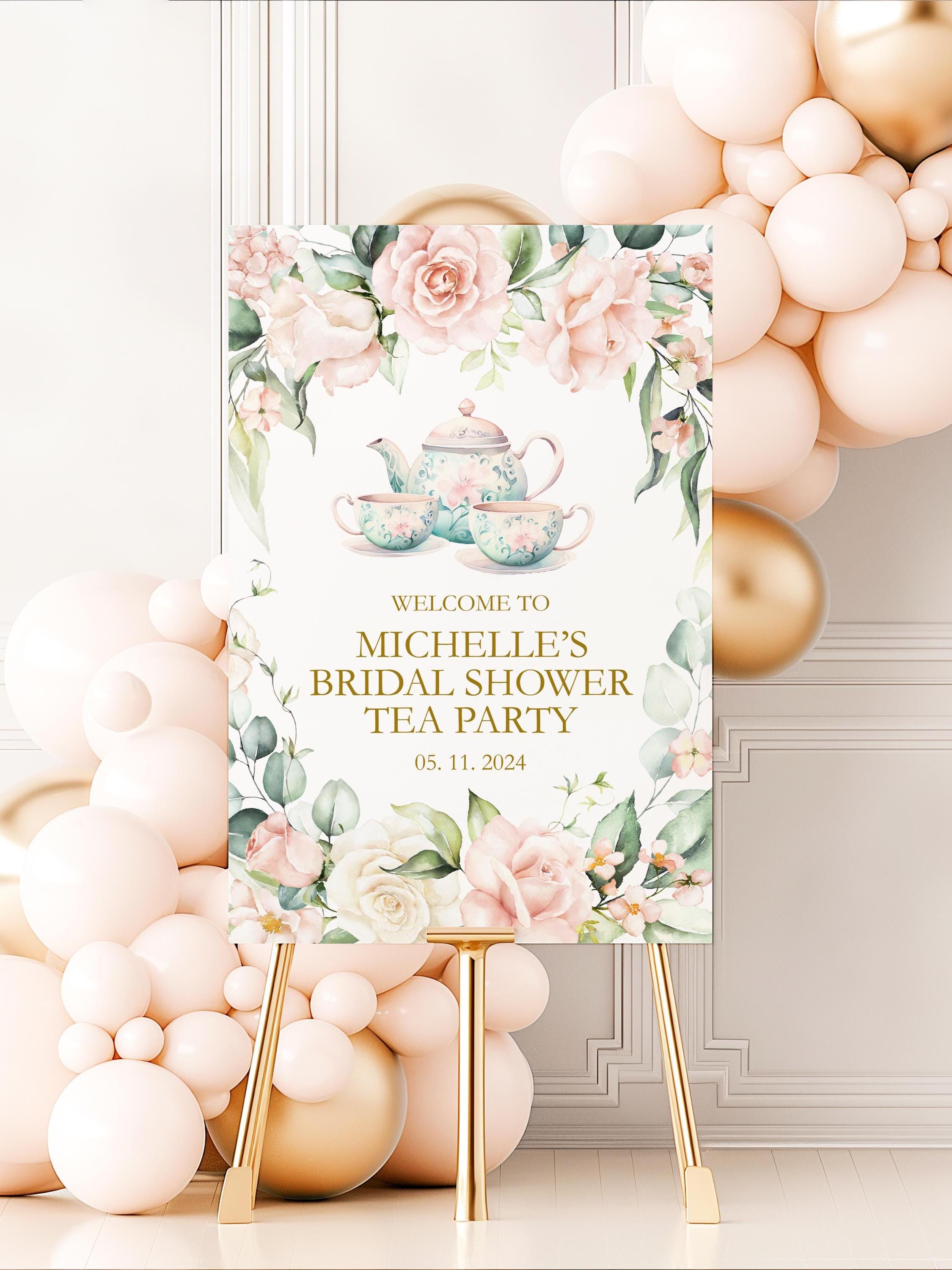 Featuring a charming floral design, this custom welcome sign captures the essence of a whimsical tea party, blending elegance with a touch of fun. Personalize it with the bride’s name and the date of the event to create a unique piece that reflects your theme and adds a personal touch to the festivities.