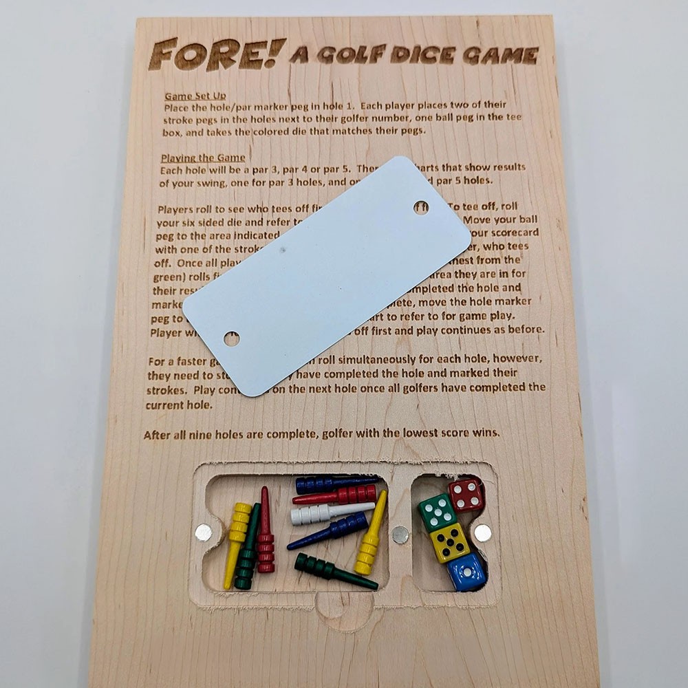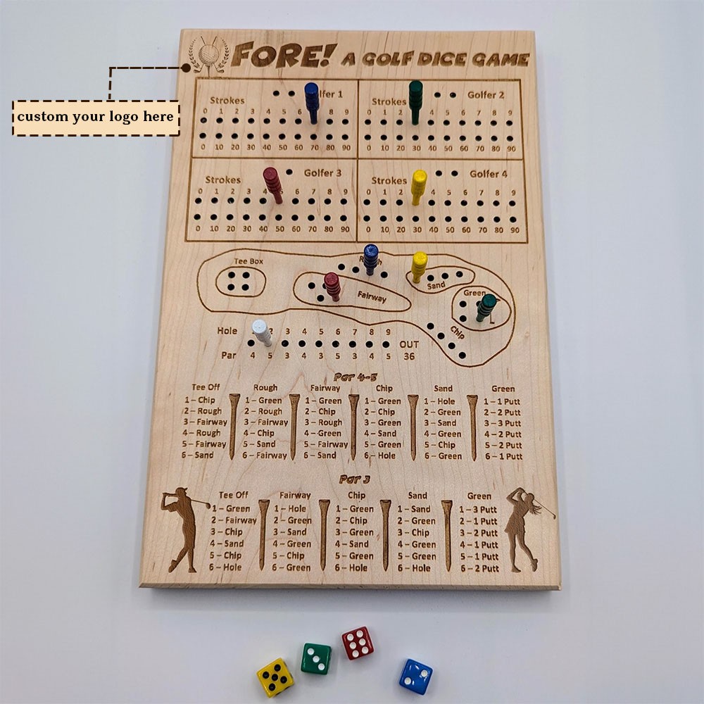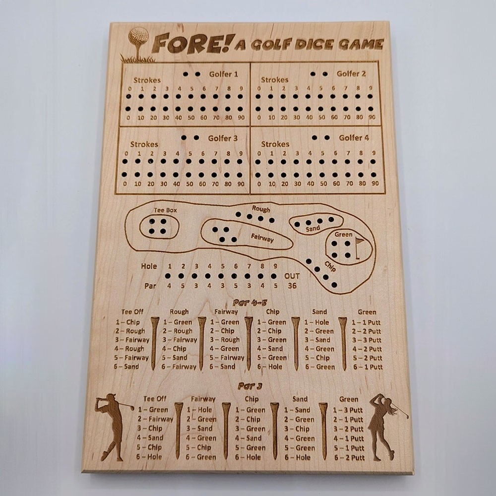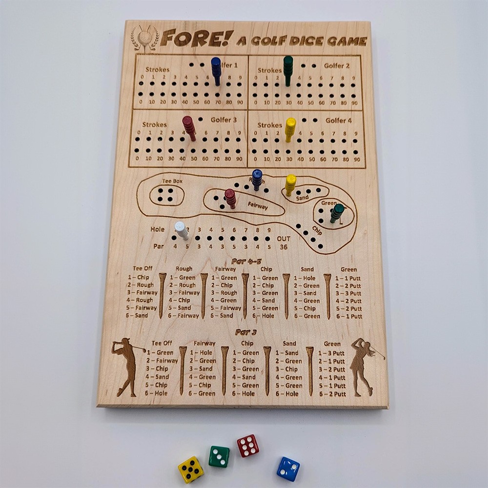 Fore! is a fast paced dice game where you play a round of golf with your friends. Great to have at the clubhouse after you play your real round, at home for those rainy days, or anywhere else you want to enjoy a round of golf with your friends and family.