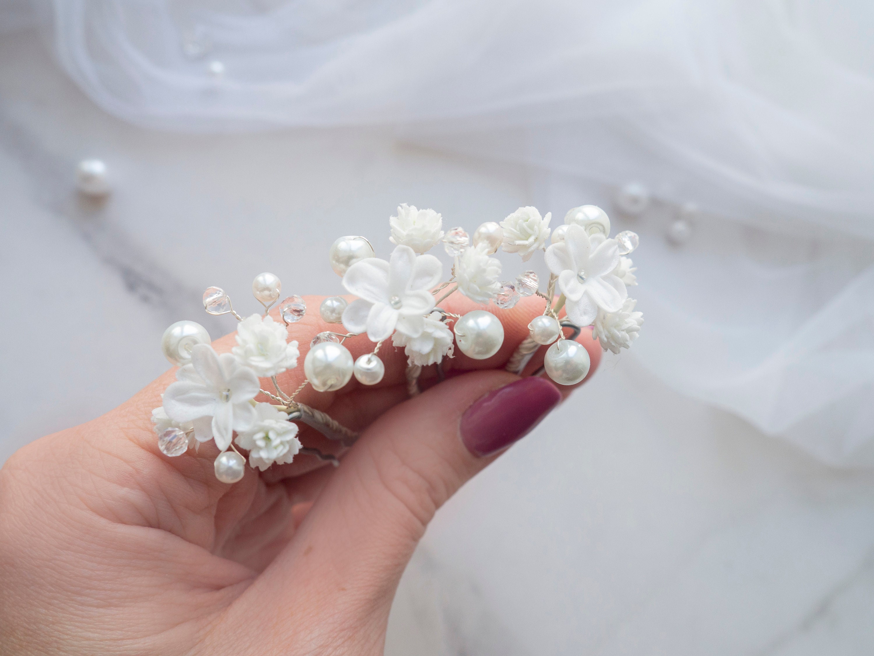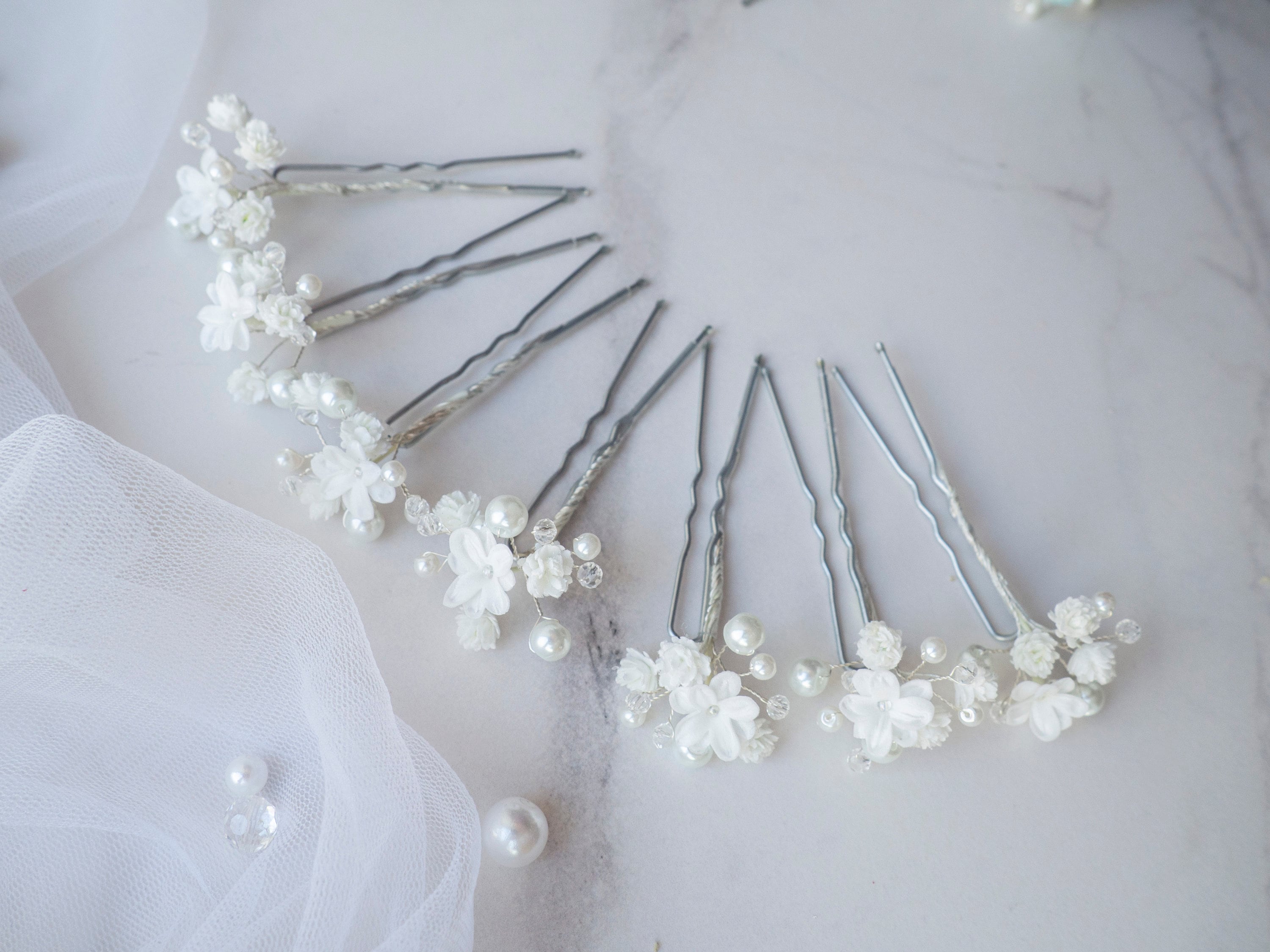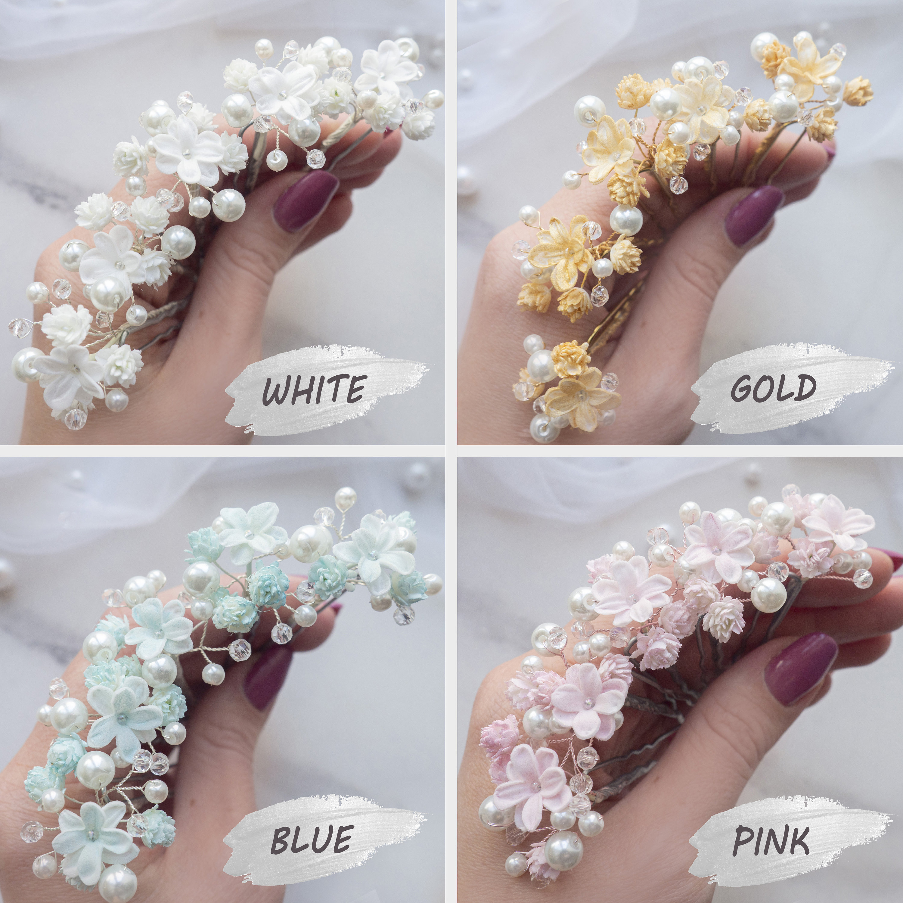 Wedding hair piece with babys breath hair flowers and pearl hair pins are compliment many different styles. These tiny flower hair pins with real touch flowers look amazing in any hair style.
