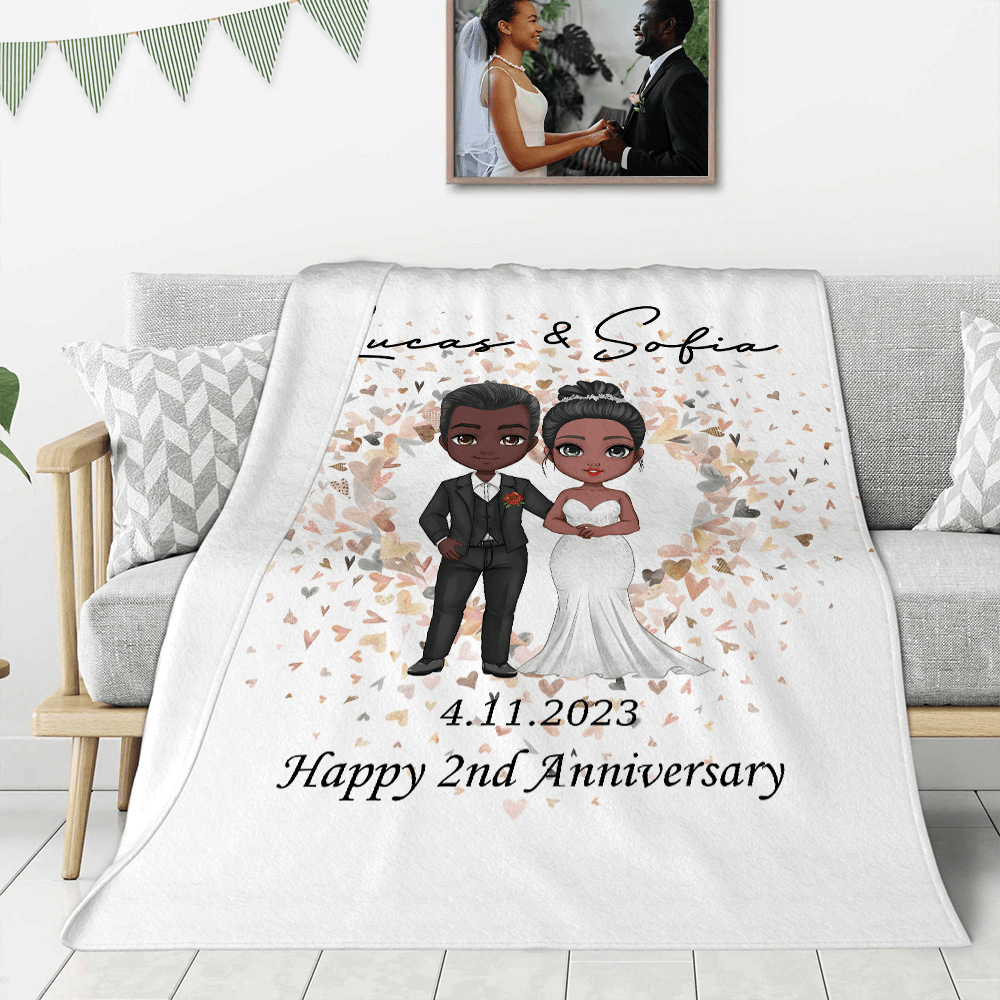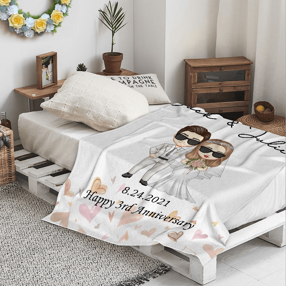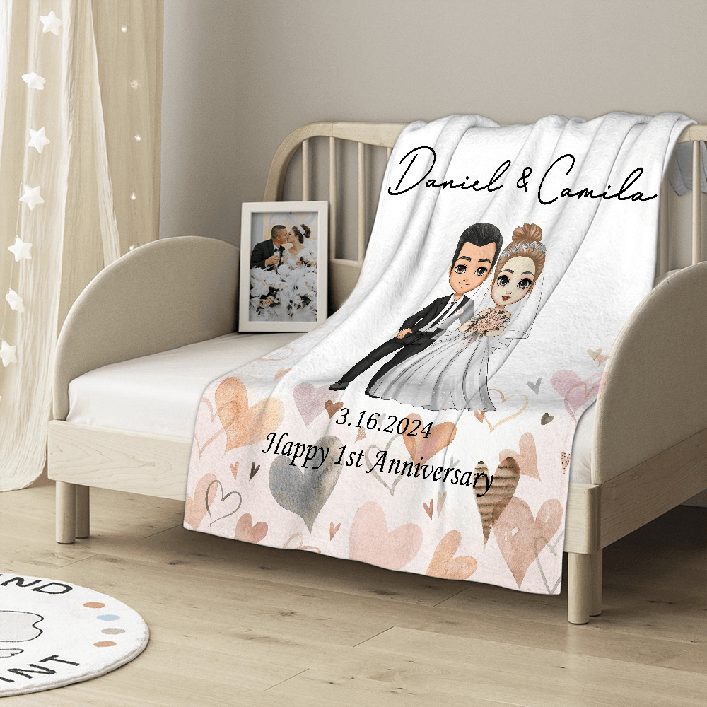 Personalized Touch - Adorned with a charming cartoon bride and groom, this blanket can be personalized with your names and wedding date, making it a cozy tribute to your love story.