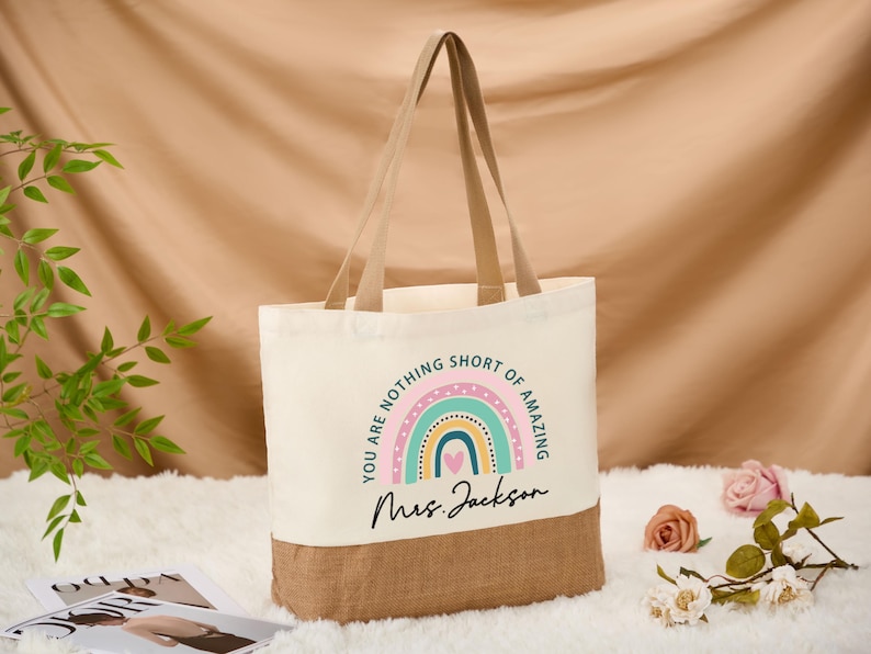This personalized canvas colorblock tote bag is a great gift for teachers. There are 12 designs in total, you can choose the one that suits your teacher's style. The bag is also large in capacity, you can put anything you want in it, such as books, water cups, glasses, etc. The shoulder strap width is 1.5 inches, which is more comfortable to carry on the shoulder.