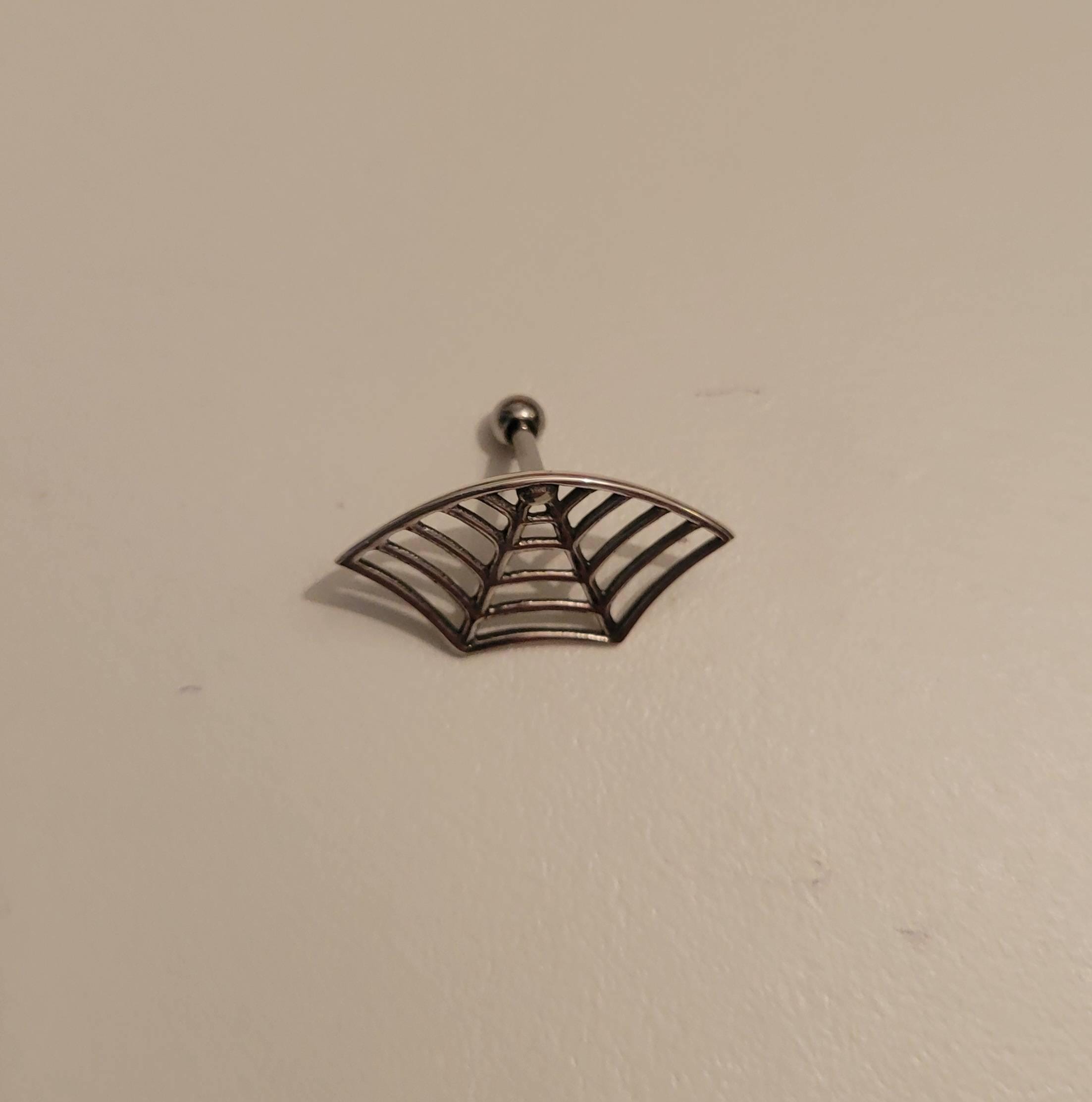 Gothic Spider Web Silver Helix Earring. This design is made of solid 925 Sterling Silver and 316L Surgical Steel. It is finished with an oxidized look and 24K gold plating. Sold by the piece.