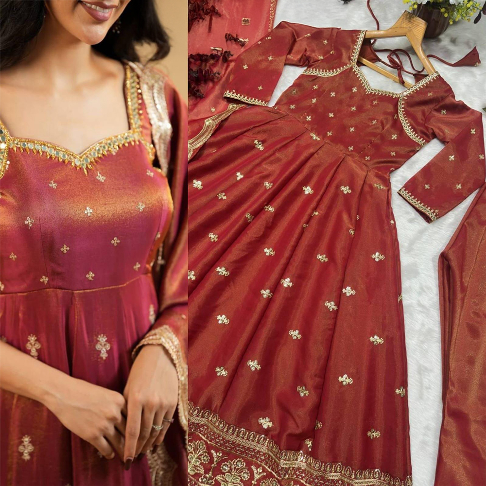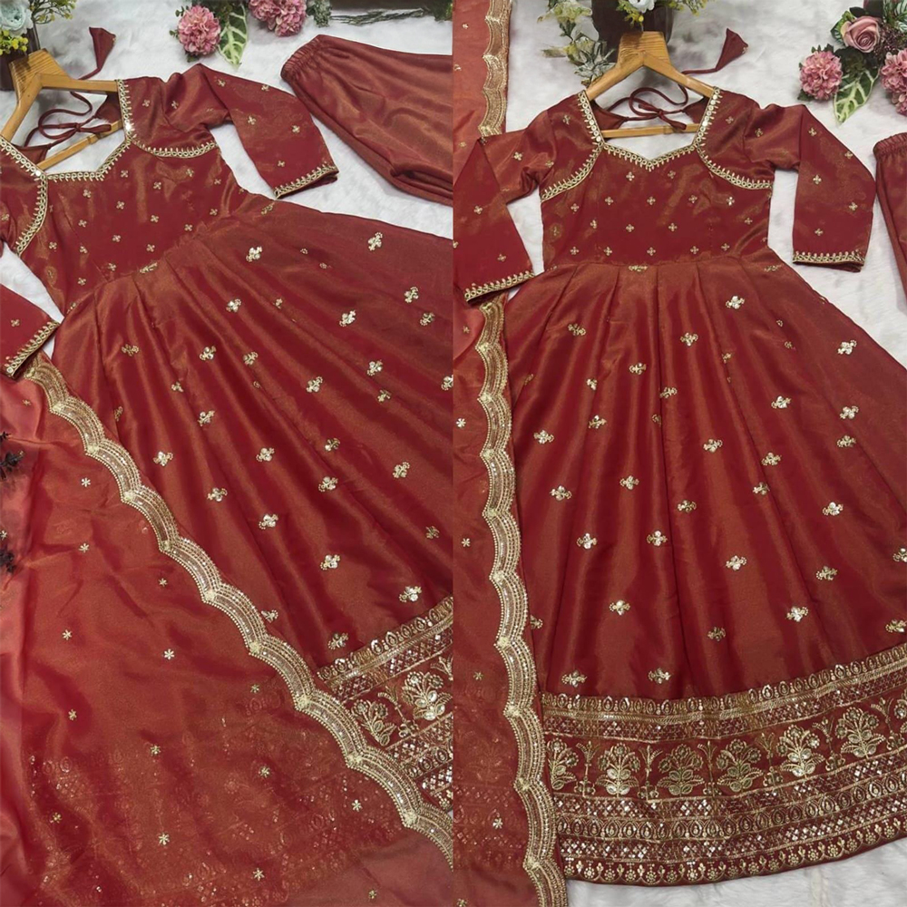 Step into elegance with our Heavy Embroidered Anarkali Gown, the perfect choice for weddings and special occasions. This stunning ethnic wear is designed to make you feel like royalty, featuring intricate embroidery that showcases exquisite craftsmanship. The gown boasts a flared silhouette that gracefully enhances your figure, making it an ideal outfit for celebrations, parties, or formal events.